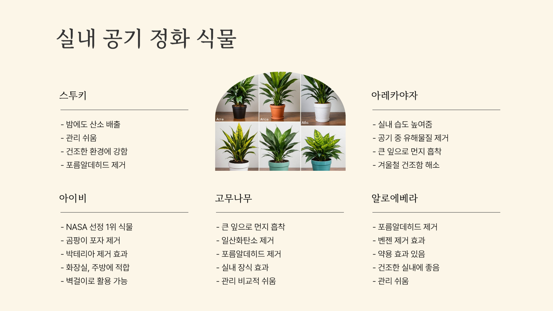 - 스투키 (Snake Plant): 밤에도 산소를 내뿜는 몇 안 되는 식물 중 하나예요. 관리도 쉽고 건조한 환경에서도 잘 자라요. 포름알데히드 같은 유해물질 제거에 탁월하죠.